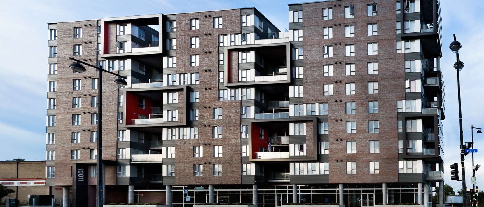 Encompassing a total of 108 condominiums spread over ten floors, the Alinéa project was completed in 2013. Architecturally speaking, the combination of earthy grey and red colours, mixed with metal, brick and polished glass, gives a very modern look to the building. The cubic structures which are grafted to the set and the interspersed loggia type balconies make for a bold architectural quality.