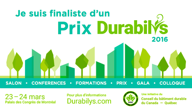 Initiated by the Québec chapter of the Canada Green Building Council (CBDCa-Qc), the Durabilys Awards were created to make known projects that meet all the standards set for sustainable buildings and reward developers and stakeholders in the field of sustainable buildings in Québec. The awards will be presented at the official reception of Les journées Durabilys, which will be held at Montréal’s Palais des congrès on March 23 and 24, and which include lectures, training and a trade show.