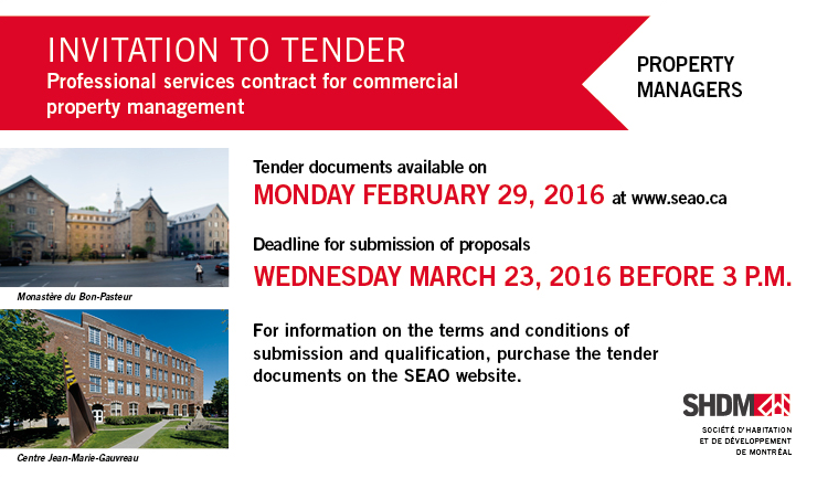 The SHDM (Société d’habitation et de développement de Montréal) is issuing a public call for proposals for the management of three SHDM properties whose management contracts expire on June 1, 2016.