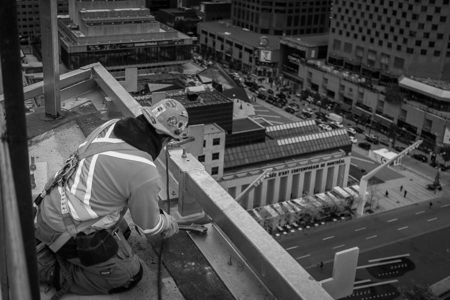 Voyez des éléments de Montréal comme vous ne les avez jamais vus, comme le Musée d’art contemporain (MACM), la Place des arts ou les toits du centre-ville grâce aux clichés de ce jeune artiste. Et soyez, vous aussi, interpellés par le jeu d’échelle qui se dessine entre l’immensité de la ville et du projet de l’Îlot Balmoral, et la dimension humaine du chantier avec ses travailleurs, qui boulon après boulon, vis après vis, construisent de leurs mains expertes une partie du futur paysage de nos grands festivals montréalais !
