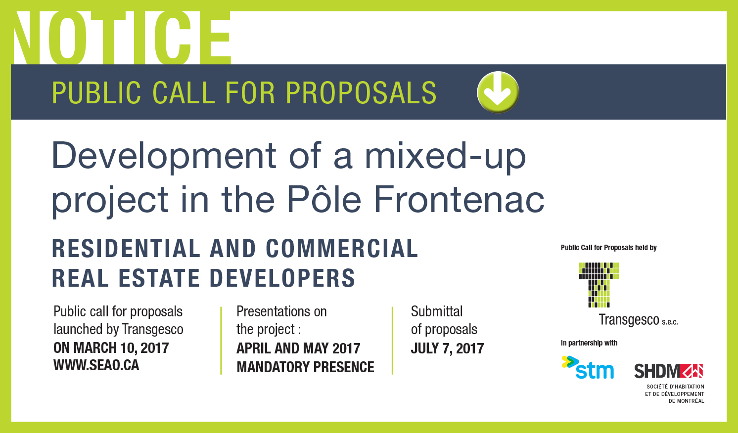La Société d´habitation et de développement de Montréal (SHDM) invite les entrepreneurs en immobilier résidentiel et commercial à prendre connaissance de l’appel public de propositions qui sera lancé sur SEAO, le 10 mars 2017 par Transgesco, filiale de la STM, pour la réalisation d’un projet immobilier à usage mixte dans le pôle Frontenac.